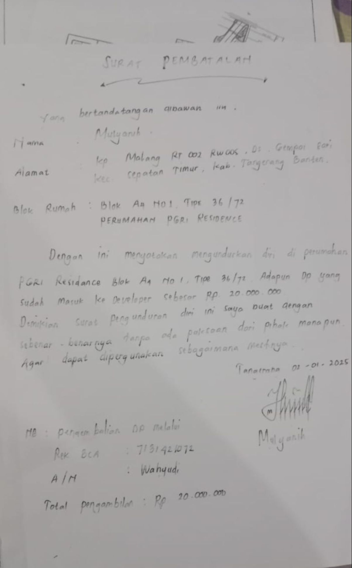 “Surat terbuka ini saya buat sebagai bentuk kekecewaan kepada manajemen PT Multi Global Hasana. Sampai detik ini tidak ada itikad baik atas pembatalan pembelian rumah yang saya ajukan,” ungkap MW.