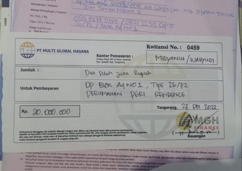 MW menjelaskan, pada akhir Desember 2022 dirinya melakukan pembayaran uang muka sebesar Rp20 juta untuk pembelian rumah secara bertahap di PGRI Residence. Keyakinannya membeli unit tersebut karena melihat adanya progres pembangunan tahap 1 dan 2.
