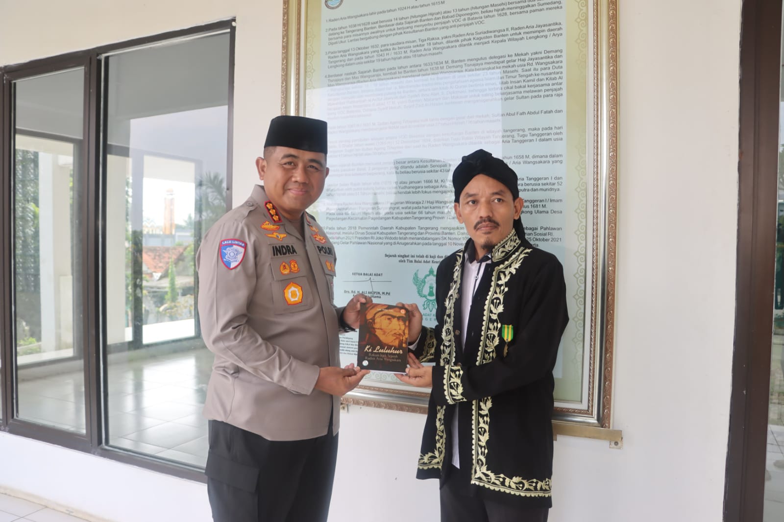 Tak hanya mendengarkan kisah secara lisan, Kapolresta juga membaca langsung sejarah yang dipajang di dinding bangunan makam. Sebagai bentuk penghargaan dan penguatan nilai sejarah, Kombes Pol Indra Waspada kemudian mendapatkan hadiah berupa buku berjudul “Ki Luluhur: Rekam Jejak Sejarah Raden Aria Wangsakara” karya Lutfi Abdul Gani. Buku tersebut menjadi simbol penting dalam menggali lebih dalam tentang jejak langkah, perjuangan, dan warisan nilai luhur Raden Aria Wangsakara.