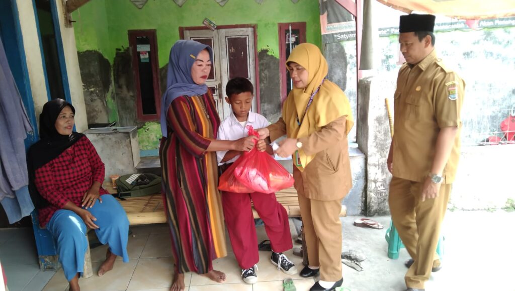 Hj. Titi Atiah memberikan paket sembako kepada Eko Supardi, anak piatu yang telah ditinggalkan ayahnya sejak kecil, pada Senin (20/10/2025).