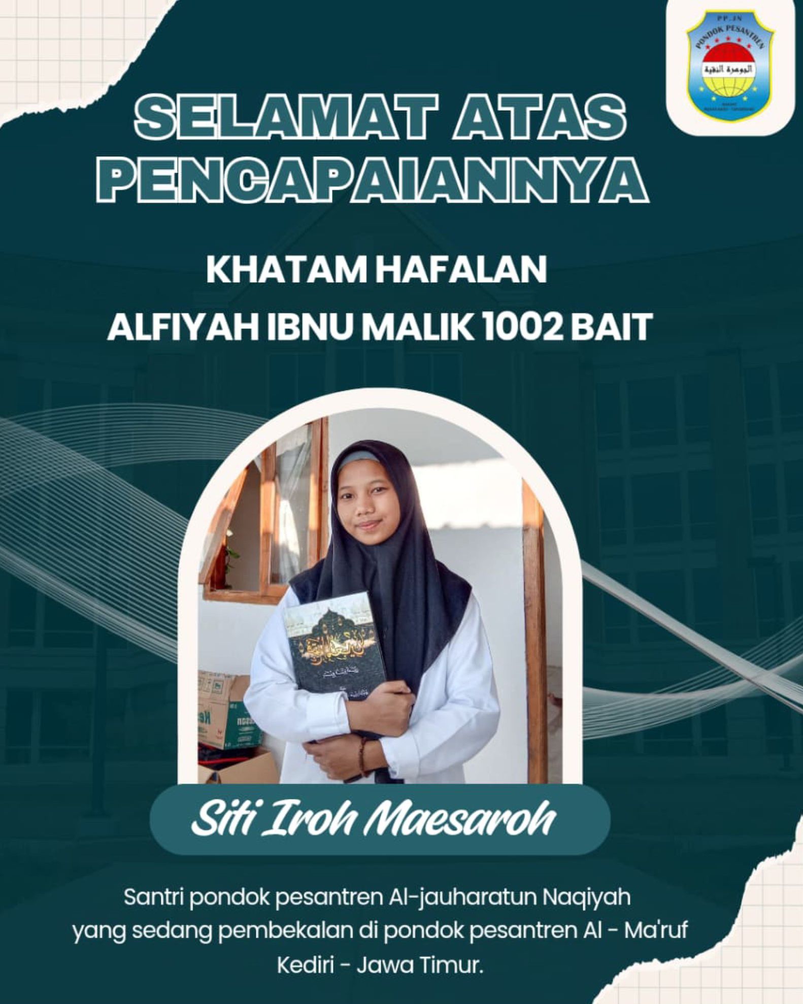 “Alhamdulillah, saya bangga atas keberhasilan anak didik kami, saudari Siti Iroh Maesaroh yang telah menyelesaikan hafalan Alfiyah dalam program pembekalan di Ponpes Al-Ma’ruf, Pare, Kediri” tutur beliau.
